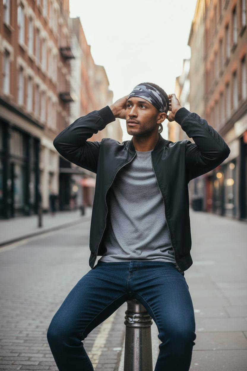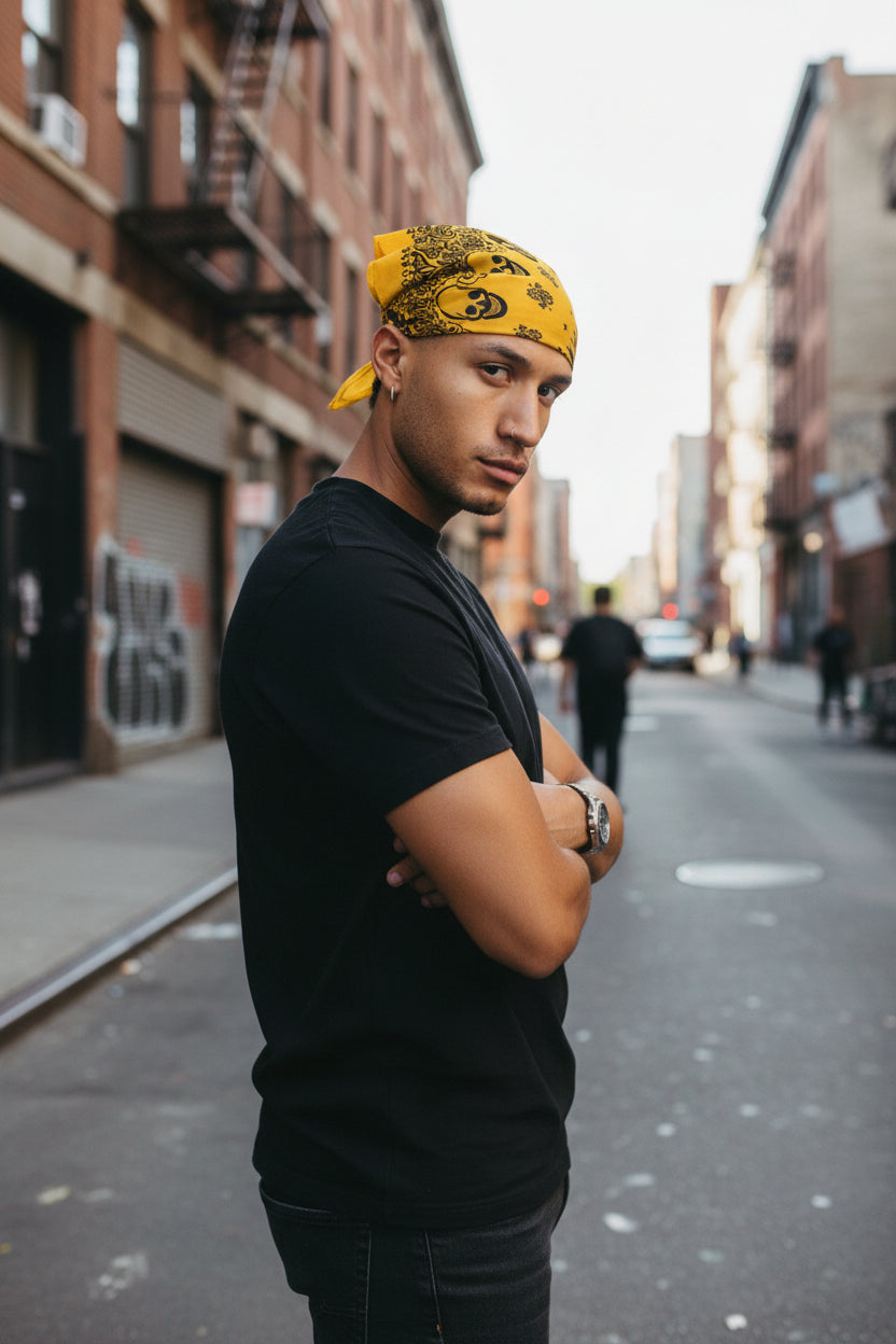Bandanas are versatile, usually square-shaped pieces of cloth—often featuring a paisley pattern—designed to be worn around the neck, head, or face. Headbands function as headbands, neckerchiefs, sweatbands, or, for protection in dusty environments.